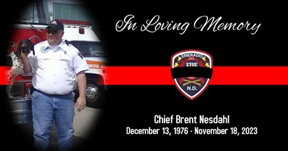 It is with a heavy heart and great sadness that the Emerado Volunteer Fire Department announces that Chief Brent Nesdahl answered his final alarm on November 18th, 2023. Chief Nesdahl joined the Emerado Volunteer Fire Department in June of 2009 to help his community, and served in many capacities, working his way through the ranks. He was appointed Chief in February of 2016, where he served until his unexpected passing. Chief Nesdahl will be missed by all, and it is asked that you keep his wife, children and grandchild in your thoughts and prayers.